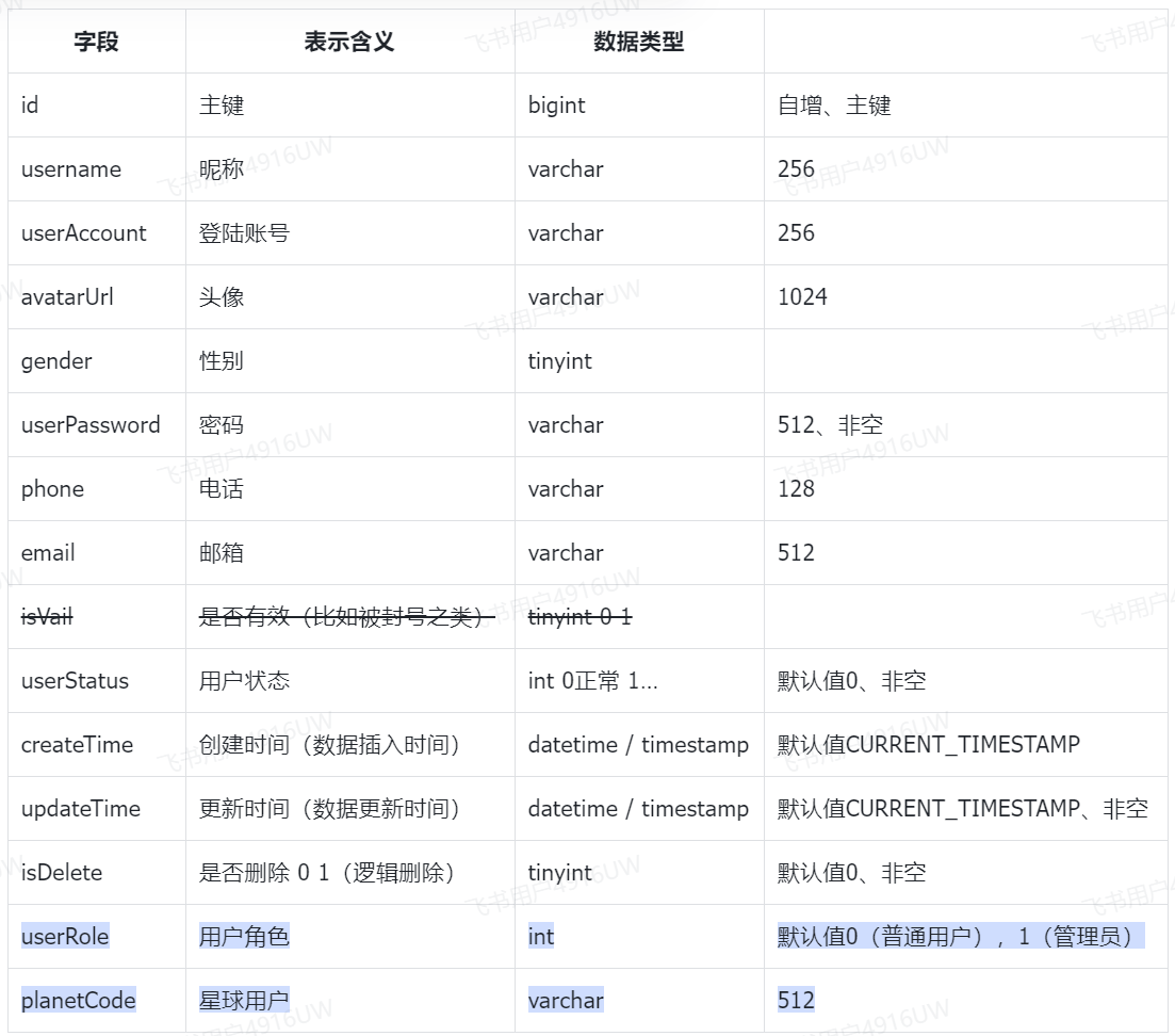 1 2 3 4 5 6 7 8 9 10 11 12 13 14 15 16 17 18 DROP TABLE IF EXISTS 'user' CREATE TABLE 'user' ( `username` varchar (256 ) NULL COMMENT '用户昵称' , `id` bigint NOT NULL AUTO_INCREMENT COMMENT 'id' , `userAccount` varchar (256 ) NULL COMMENT '账号' , `avatarUrl` varchar (1024 ) NULL COMMENT '用户头像' , `gender` tinyint NULL COMMENT '性别' , `userPassword` varchar (512 ) NOT NULL COMMENT '密码' , `phone` varchar (128 ) NULL COMMENT '电话' , `email` varchar (512 ) NULL COMMENT '邮箱' , `userStatus` int DEFAULT '0' NULL COMMENT '状态 0-正常' , `createTime` datetime DEFAULT CURRENT_TIMESTAMP NULL COMMENT '创建时间' , `updateTime` datetime DEFAULT CURRENT_TIMESTAMP NULL ON UPDATE CURRENT_TIMESTAMP COMMENT '更新时间' , `isDelete` tinyint DEFAULT '0' NOT NULL COMMENT '是否删除' , PRIMARY KEY (`id`) ) COMMENT= '用户表' ;
