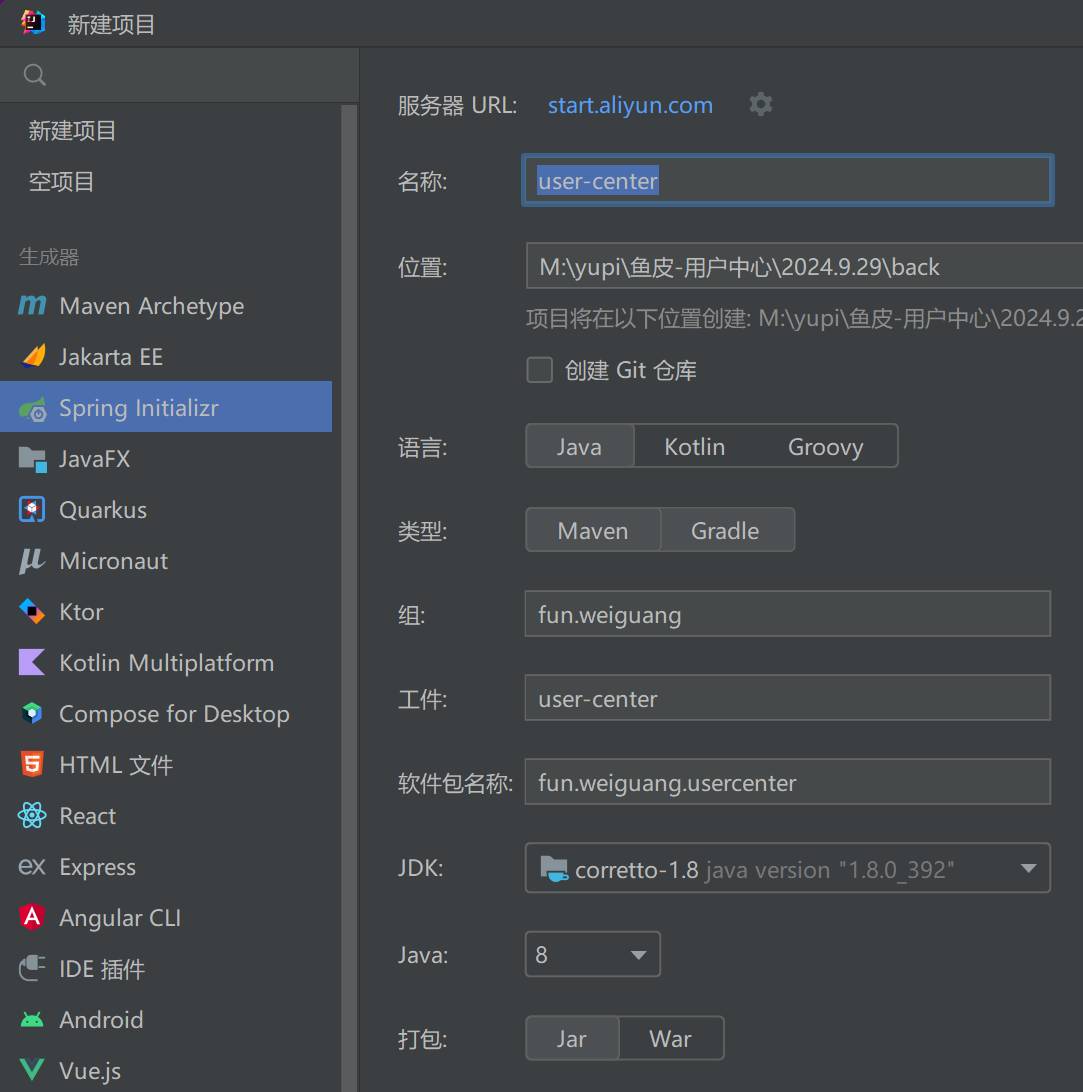 创建项目 spring.io 不支持勾选 Java 8 了 , 可以如下图所示,点击齿轮,将初始化链接换成阿里云的http://start.aliyun.com , 就可以正常选择 Java 8