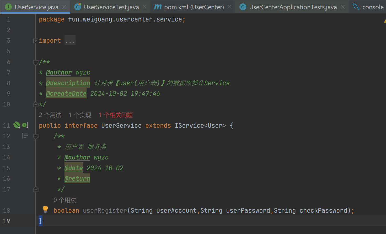 1 2 3 4 5 6 7 8 @SpringBootApplication @MapperScan("com.yupi.usercenter.mapper") public class UserCenterApplication { public static void main (String[] args) { SpringApplication.run(UserCenterApplication.class, args); } }