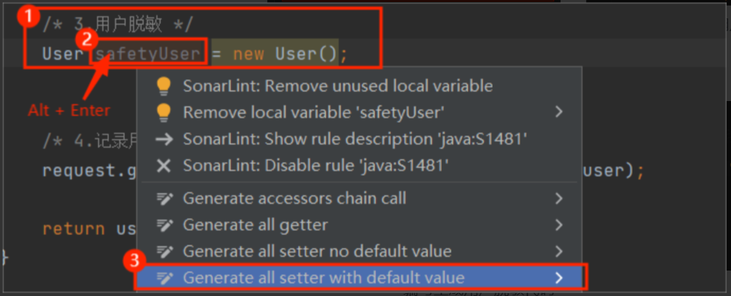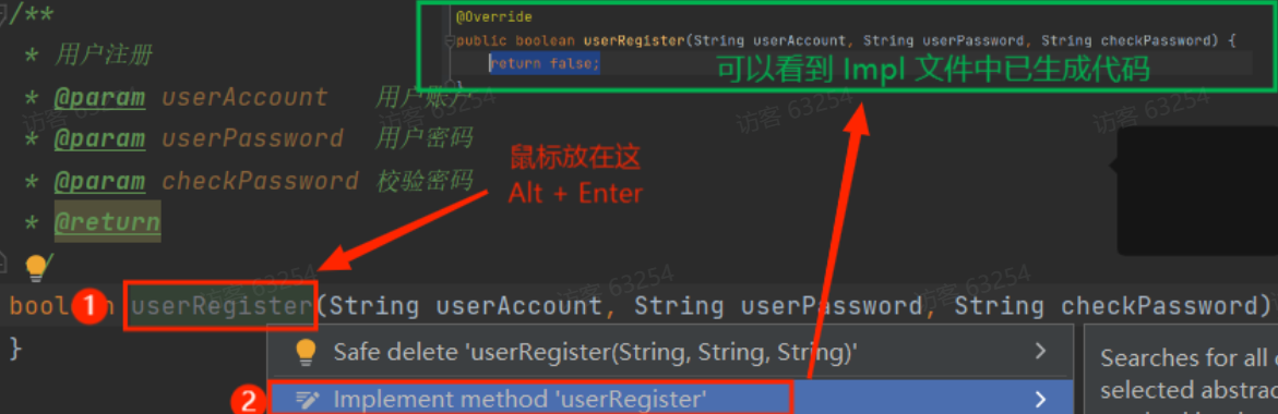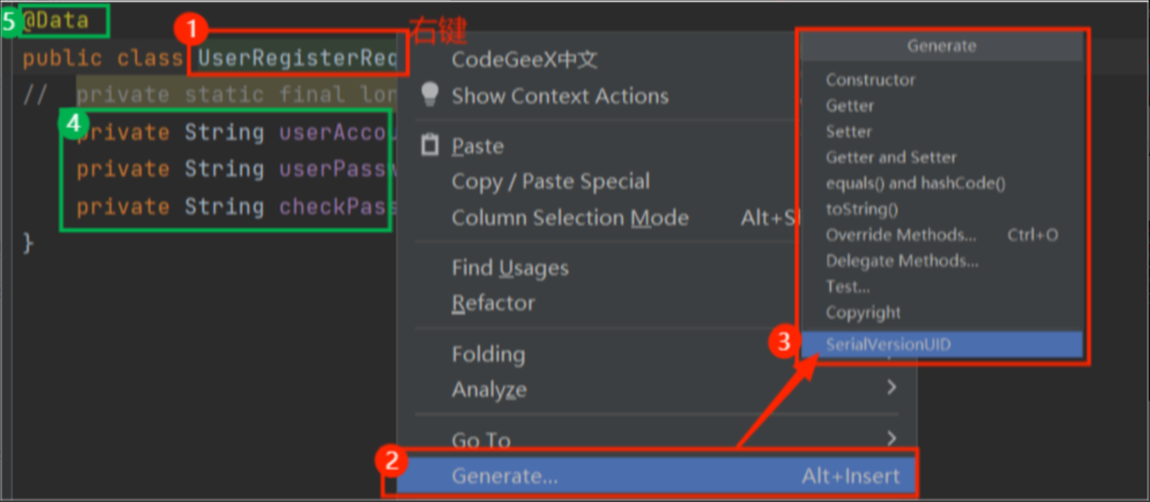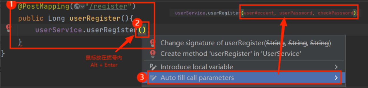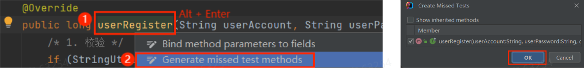 测试 ◦鼠标放在 UserService.java 文件的 UserService 上,按住 alt + enter ,选择创建测试类 ◦编写测试代码【安装插件 CenerateAllSetter ,可快速生成代码】 完整代码: