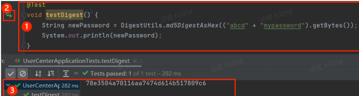 1 2 3 4 5 6 7 8 9 10 11 12 13 14 15 16 17 18 19 20 @SpringBootTest class UserServiceTest {@Resource private UserService userService;@Test void testAddUser () { User user = new User (); user.setUsername("dogYupi" ); user.setUserAccount("123" ); user.setAvatarUrl("https://profile-avatar.csdnimg.cn/aee7bf7d9b0640489ce4189664a41212_2201_75344078.jpg!1" ); user.setGender(0 ); user.setUserPassword("xxx" ); user.setPhone("123" ); user.setEmail("456" ); boolean result = userService.save(user); System.out.println(user.getId()); Assertions.assertTrue(result); }