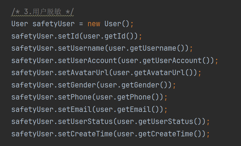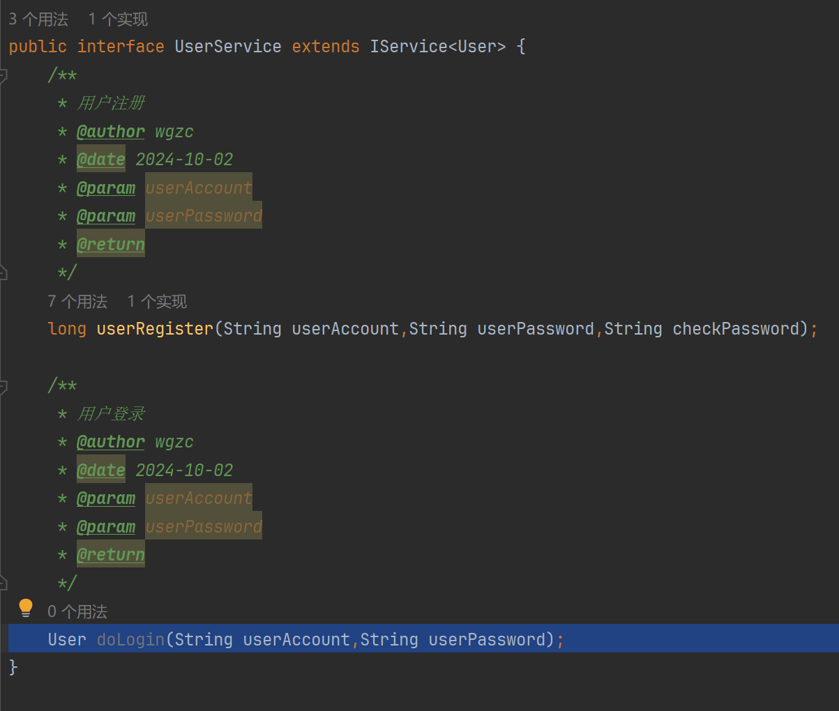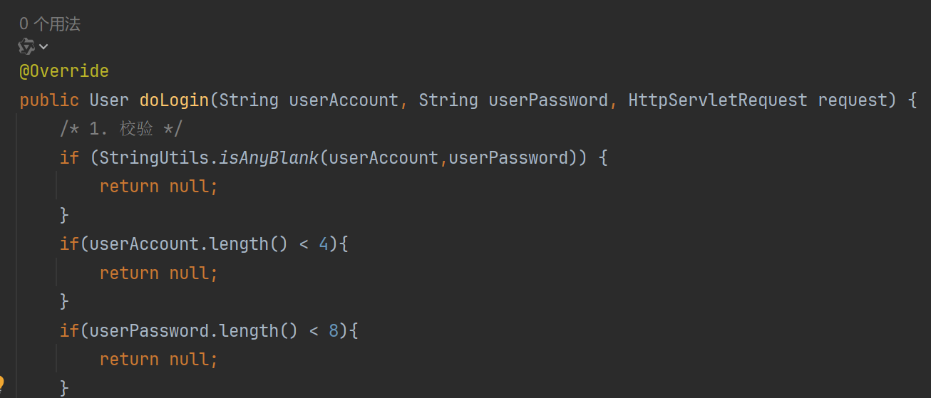 1 2 3 4 5 6 7 8 9 10 11 12 13 14 15 16 17 18 19 20 21 22 23 24 25 26 27 28 29 30 31 32 33 @Override public long userRegister (String userAccount, String userPassword, String checkPassword, String planetCode) { if (StringUtils.isAnyBlank(userAccount,userPassword,checkPassword,planetCode)) { throw new BusinessException (ErrorCode.PARAMS_ERROR, "参数为空" ); } if (userAccount.length() < 4 ){ throw new BusinessException (ErrorCode.PARAMS_ERROR, "用户账号过短" ); } if (userPassword.length() < 8 || checkPassword.length() < 8 ){ throw new BusinessException (ErrorCode.PARAMS_ERROR, "密码长度过短" ); } if (planetCode.length() > 5 ){ throw new BusinessException (ErrorCode.PARAMS_ERROR, "星球编号过长" ); } …… QueryWrapper<User> queryWrapper = new QueryWrapper <>(); queryWrapper.eq("userAccount" ,userAccount); long count = userMapper.selectCount(queryWrapper);if (count > 0 ) { throw new BusinessException (ErrorCode.PARAMS_ERROR, "用户账号重复" ); } queryWrapper = new QueryWrapper <>(); queryWrapper.eq("planetCode" ,planetCode); count = userMapper.selectCount(queryWrapper); if (count > 0 ) { throw new BusinessException (ErrorCode.PARAMS_ERROR, "星球编号重复" ); }