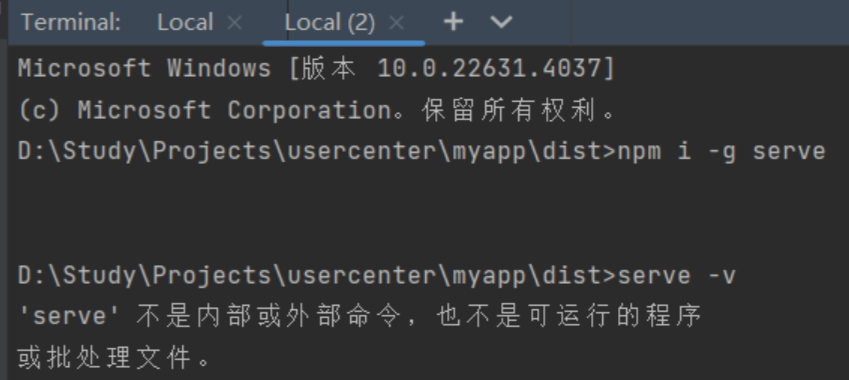 解决: ◦删除 .npmrc 文件中上述两个配置 或者直接删除文件然后重新配置一下镜像源【查找该文件的位置 cmd 命令行输入如下命令 npm config ls 】,执行 serve 全局安装命令即可 ◦或者试试将之前 prefix 配置的位置增加到环境变量 PATH 中