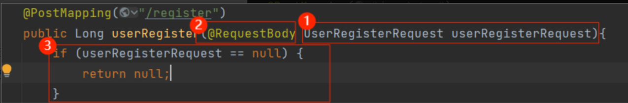 1 2 3 4 5 6 7 8 9 10 11 12 13 14 15 16 17 18 19 20 21 22 23 24 25 26 27 28 29 @PostMapping("/register") public BaseResponse<Long> userRegister (@RequestBody UserRegisterRequest userRegisterRequest) { if (userRegisterRequest == null ) { return ResultUtils.error(ErrorCode.PARAMS_ERROR); } String userAccount = userRegisterRequest.getUserAccount(); String userPassword = userRegisterRequest.getUserPassword(); String checkPassword = userRegisterRequest.getCheckPassword(); String planetCode = userRegisterRequest.getPlanetCode(); if (StringUtils.isAnyBlank(userAccount, userPassword, checkPassword,planetCode)){ return null ; } long result = userService.userRegister(userAccount, userPassword, checkPassword, planetCode); return ResultUtils.success(result); } @PostMapping("/login") public BaseResponse<User> userLogin (@RequestBody UserLoginRequest userLoginRequest, HttpServletRequest request) { if (userLoginRequest == null ) { return ResultUtils.error(ErrorCode.PARAMS_ERROR); } String userAccount = userLoginRequest.getUserAccount(); String userPassword = userLoginRequest.getUserPassword(); if (StringUtils.isAnyBlank(userAccount, userPassword)) { return ResultUtils.error(ErrorCode.PARAMS_ERROR); } User user = userService.userLogin(userAccount, userPassword, request); return ResultUtils.success(user); }